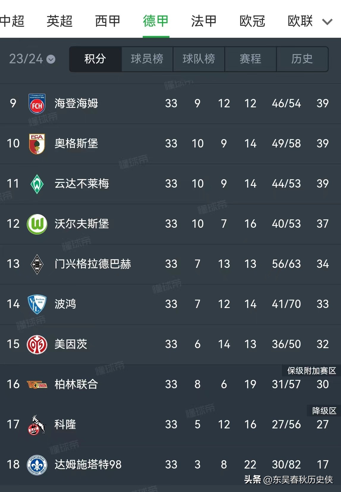 达姆施塔德已经降级,波鸿只需一分就成功上岸,降级的球队大概率会在科隆、柏林联合、美因茨3家之间产生。