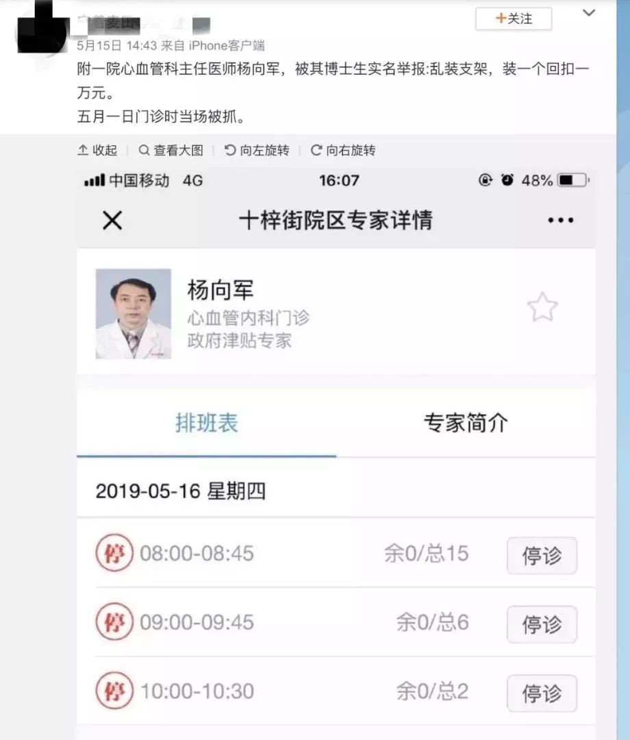 日前,有微博用户爆料称苏州大学附属第一医院心血管主任医师杨向军,被其博士生实名举报:乱装支架,装一个回扣一万元。