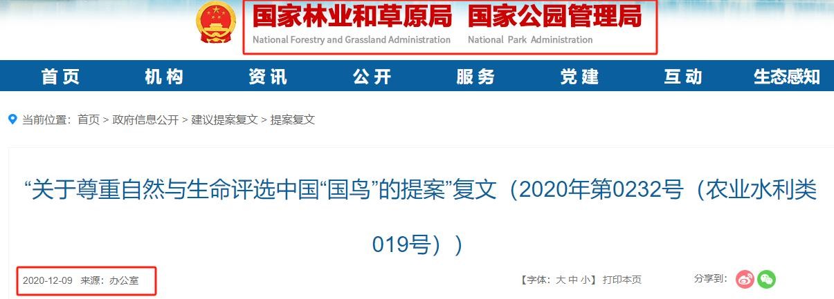 2.国家林业和草原局2020年12月9日:“关于尊重自然与生命评选中国“国鸟”的提案”复文(2020年第0232号(农业水利类 019号))