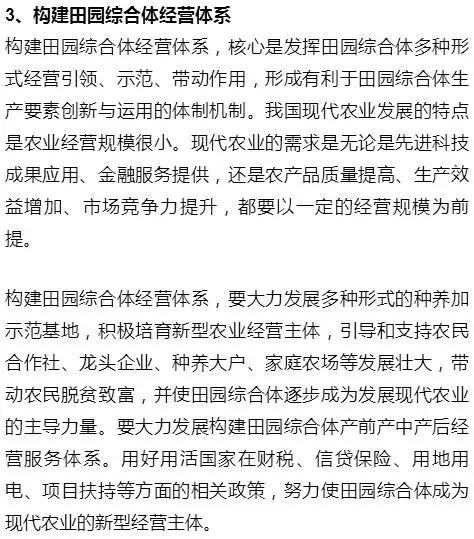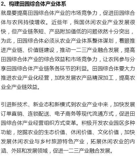 2017年“田园综合体”一词被正式写入中央1号文件,原文如下:支持有条件的乡村建设以农民合作社为主要载体、让农民充分参与和受益,集循环农业、创意农业、农事体验于一体的田园综合体,通过农业综合开发、农村综合改革转移支付等渠道开展试点示范。