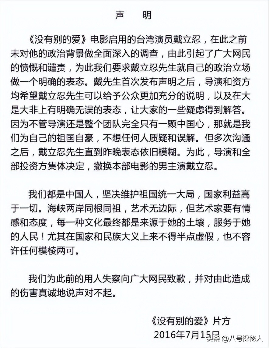 7月15日,在事件的发酵下,片方发布最新声明,表示撤掉男主戴立忍。