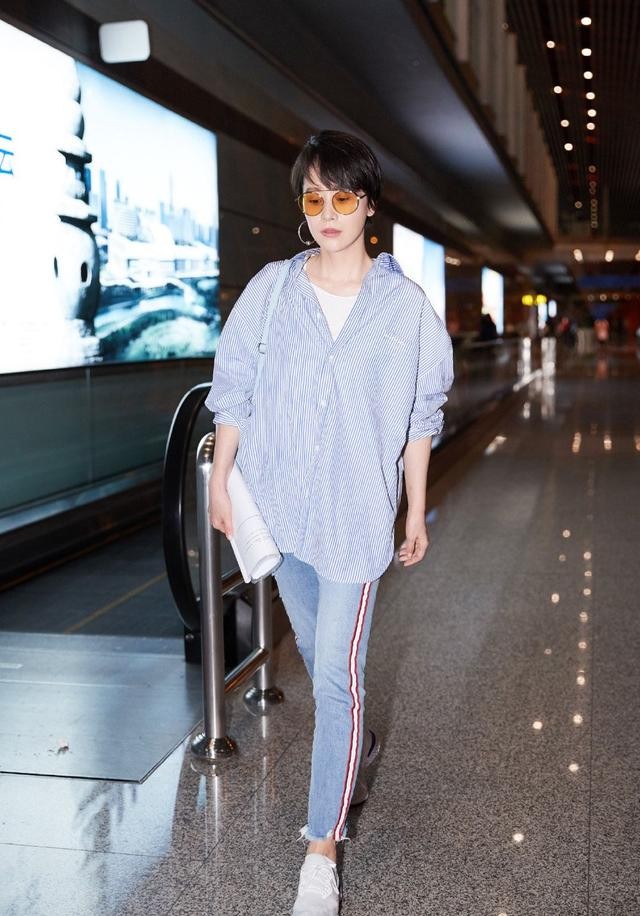 衬衫作为时尚的单品,它的运用性十分广泛、驾驭能力非常好,海清的这件蓝色竖条纹衬衫十分清爽干练,内搭一件圆领T恤,衬衫随意扣上三颗纽扣,看上去随性减龄效果非常棒,同时这样穿搭很有亮点,这样叠穿法层次分明。配上紧身牛仔裤,上松下紧的穿搭方式,很适合海清的身材,视觉上又有显瘦的作用。