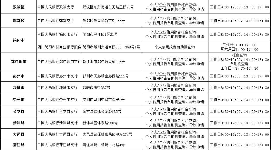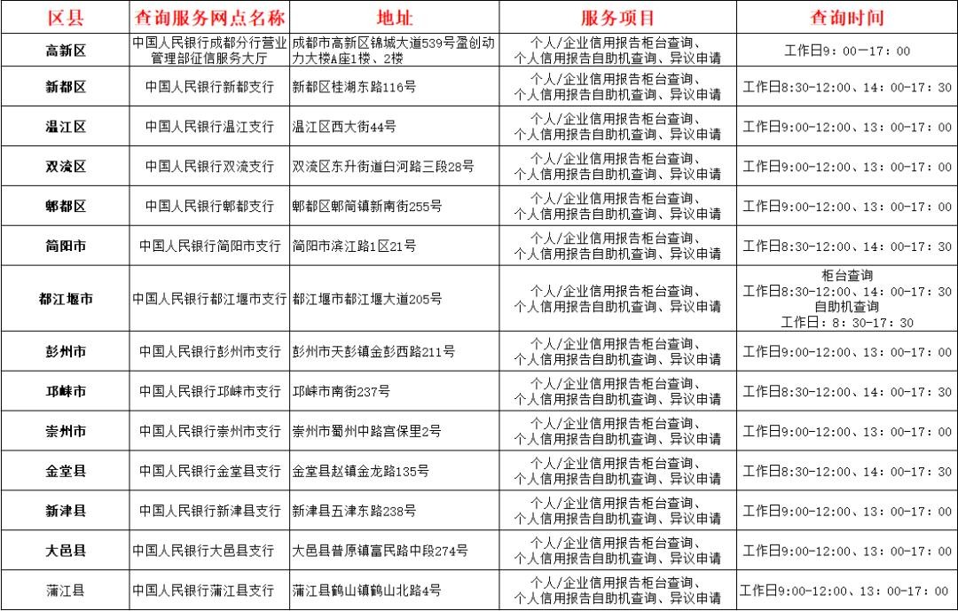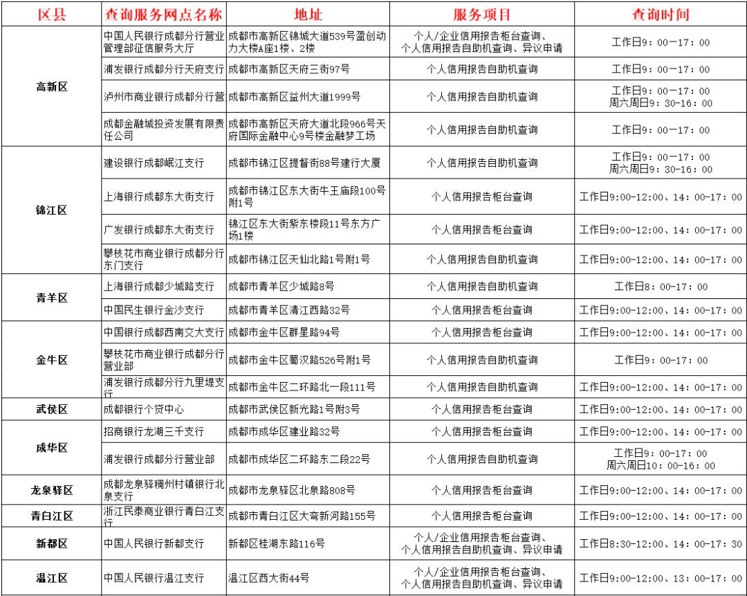 最后是自助查询,全能老师整理了目前成都的个人(企业)信用报告查询服务网点自助机。以下是成都范围内支持自助查询个人征信的网点: