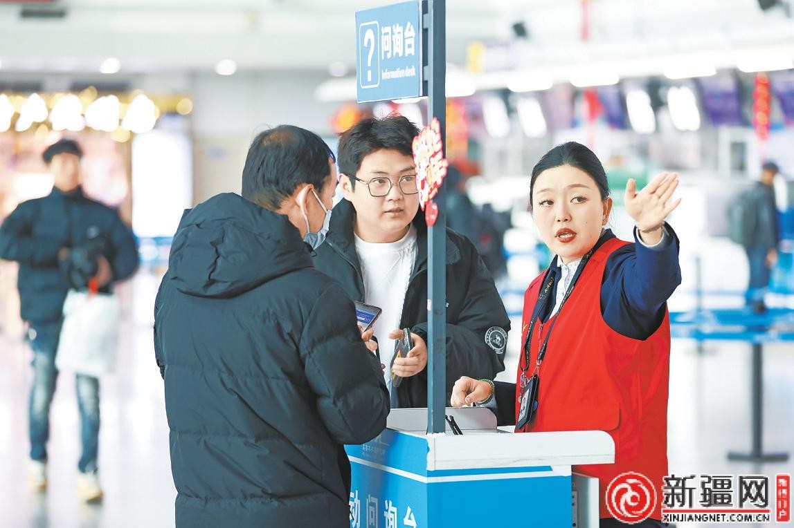 2月20日,在乌鲁木齐国际机场T2航站楼,机场工作人员为旅客提供问询服务。