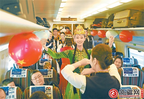 1月14日,2025年春运首日,在乌鲁木齐至哈密的D8806次动车车厢内,乘务员载歌载舞为旅客送上新年祝福。