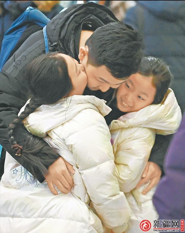 在乌鲁木齐国际机场T3航站楼,双胞胎姐妹向父亲送上拥抱和亲吻,用最温情的方式迎接亲人回家。(1月27日摄)