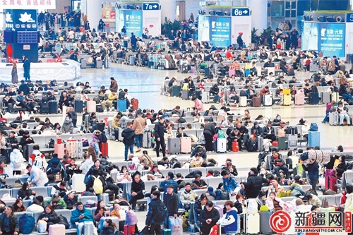 2月22日,乌鲁木齐站候车大厅内旅客摩肩擦踵,座无虚席。