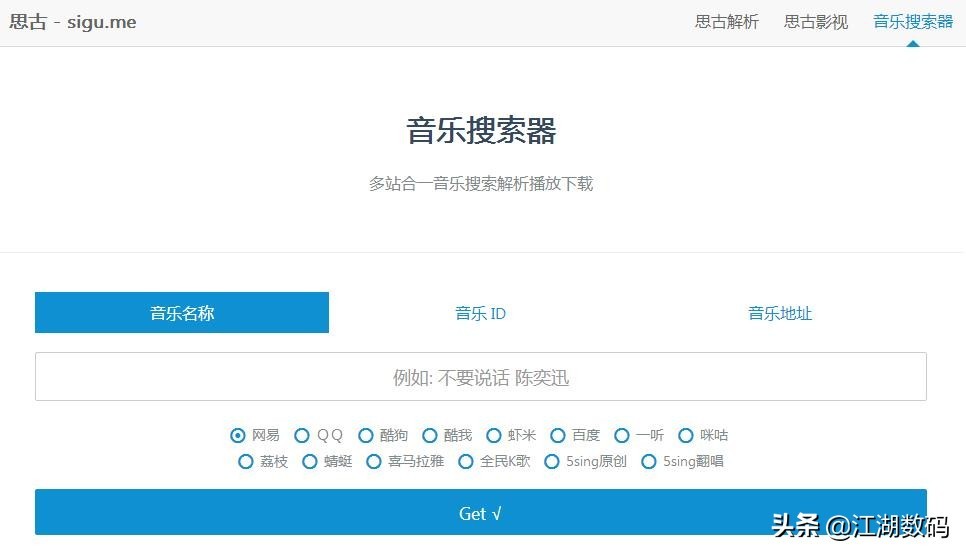音乐搜索器,这是一个多站合一的音乐搜索网站,在这个网站你可以听网易、QQ、酷狗、酷我、虾米、百度、一听、咪咕、荔枝、蜻蜓、喜马拉雅、全民K歌、5sing原创、5sing翻唱等多个不同平台的音乐。