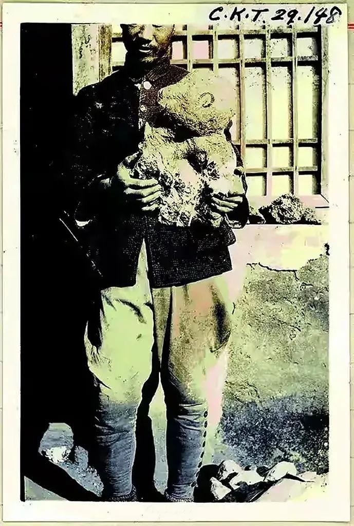 裴文中捧着刚发现的打着石膏的北京人头骨化石