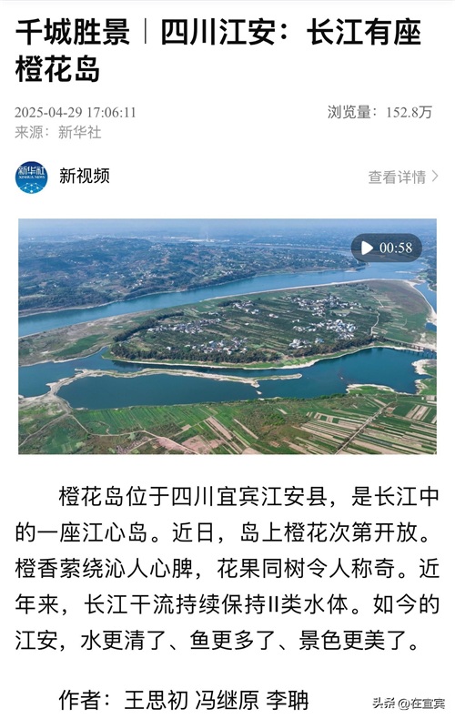 4月29日,新华社以《千城胜景|四川江安:长江有座橙花岛》(点击看全文)为题,报道江安水更清、鱼更多、景色更美。