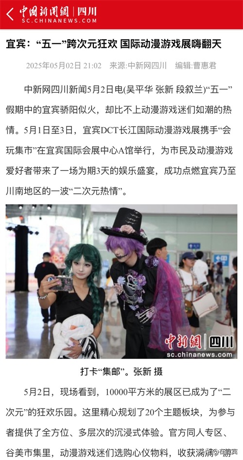 5月2日,中国新闻网以《宜宾:“五一”跨次元狂欢 国际动漫游戏展嗨翻天》(点击看全文)为题,报道宜宾打造文娱消费新场景。