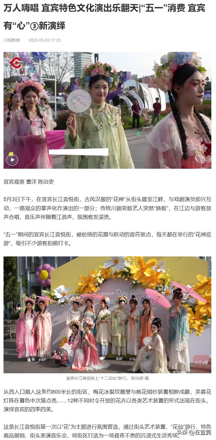 5月3日,川观新闻以《万人嗨唱 宜宾特色文化演出乐翻天丨“五一”消费 宜宾有“心”③新演绎》(点击看全文)为题,报道“五一”期间,多元玩法让宜宾焕发新活力。