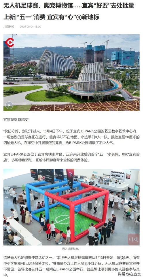 5月4日,川观新闻以《无人机足球赛、爬宠博物馆…..宜宾“好耍”去处批量上新丨“五一”消费 宜宾有“心”④新地标》(点击看全文)为题,报道宜宾高铁南片区多场特色活动给市民游客带来全新消费体验。