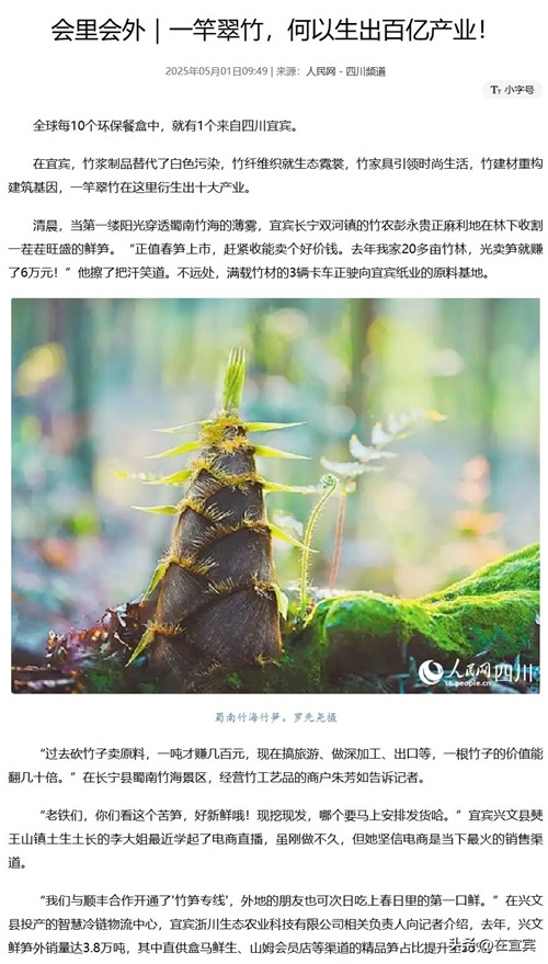 5月1日,人民网以《会里会外|一竿翠竹,何以生出百亿产业!》(点击看全文)为题,报道宜宾竹产业发展。