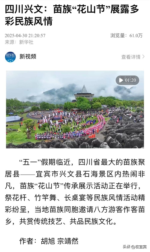 4月30日,新华社以《四川兴文:苗族“花山节”展露多彩民族风情》(点击看全文)为题,报道兴文县石海景区内,当地苗族同胞邀请八方游客作客苗乡,共赏传统技艺、共品民族文化。