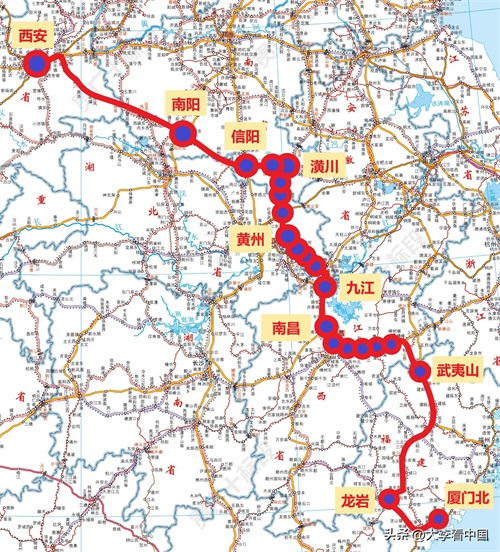 其实这趟K244以前的路线不是这么走的,以前是走鹰厦线到鹰潭走沪昆铁路到南昌,然后沿着京九、武九到武汉,到了武汉之后沿着京广铁路到河南漯河,然后从漯河再到洛阳上陇海线,最后沿着陇海线从洛阳抵达西安。那时候从厦门始发,经过郭坑、华安、漳平、永安、三明、来舟、邵武、光泽等福建省内的站点,下午两三点多始发,在福建省内就要十几个小时,然后第二天早上进入江西,进入江西之后这趟车的车速就快起来了,厦门至光泽要十来个小时,光泽至西安这段也是十来个小时,鹰厦铁路车速快不起来是主要原因。