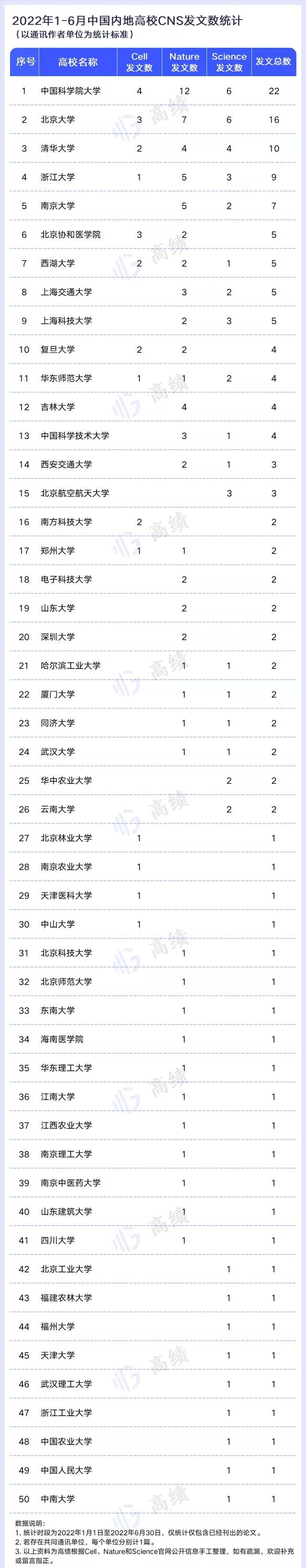 根据2022年上半年,中国内地高校作为通讯作者在Cell、Nature、Science 正刊(以下简称CNS)等国际科学顶级期刊上刊发的论文数量显示,在顶级期刊发表论文的中国大学50强榜单如下图所示: