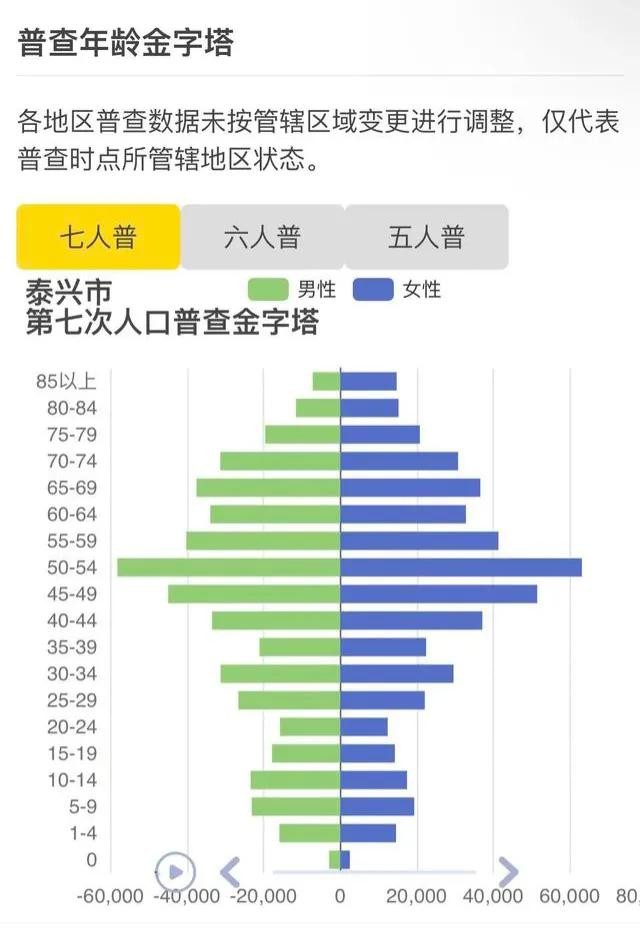 对照七普年龄金字塔我们还能发现一个有趣的现象,40-59岁的壮年劳动人口中,男性人数明显少于女性人数,具体到每一个年龄段女性都比男性多出不少,一共多出了一万一千多人,占到总人口的1%左右,占40-59岁总人口的5%左右,男女比例比较失调。不过,这个年龄段的男少女多现象也不难解释,具体原因如下:这个年龄段的人口在应该接受教育的时候国家遇到了一点困难,教育事业停摆了一些年,因此这个年龄段的很多人并没有接受良好的教育,只能以卖力气为生,尤其是男性。而泰兴作为一个小县城并没有那么多的工地或者体力活的需求,所以他们当中有不少人选择去附近的上海,苏州或者南京这样的大城市打工,靠自己的辛勤劳动谋生。