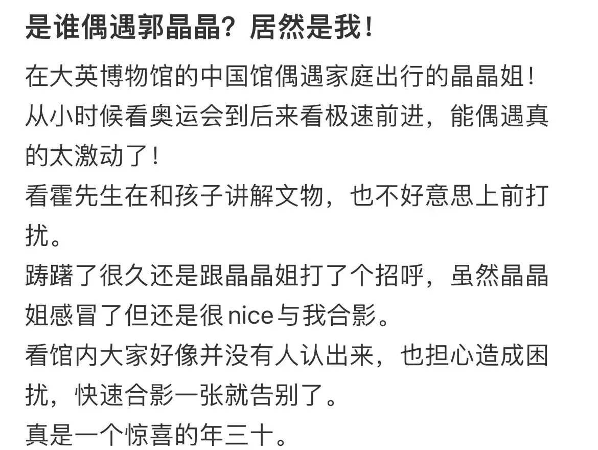 除夕当天,另一位网友也在社交平台上分享了自己在大英博物馆的偶遇。在中国馆内,他意外地遇到了郭晶晶和她的丈夫霍启刚一家。霍启刚正在耐心地给孩子讲解文物,而郭晶晶则展现出了她那温柔体贴的一面。尽管身体有些不适,她仍然笑容满面,给人一种温暖的感觉。