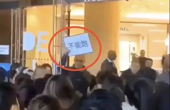 据加拿大加新网,商场还没开门,保安高举着中文字“不能跑”的牌子站在门口。
