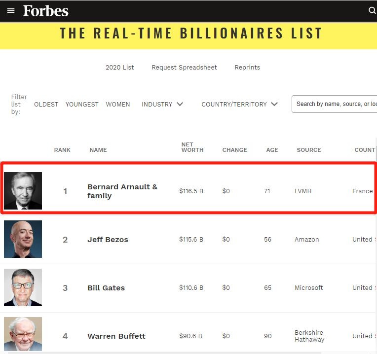 福布斯实时数据显示,LV总裁贝尔纳·阿尔诺替代亚马逊创始人贝索斯成为世界首富。