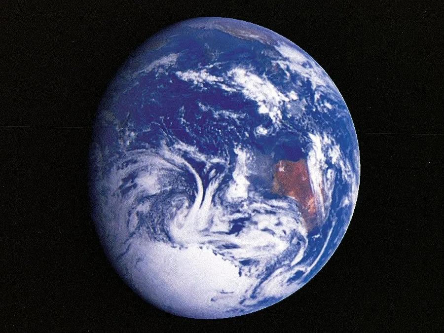 1972 年,阿波罗 17 号航天器上的宇航员在航天器前往月球时捕捉到了令人惊叹的地球图像。广阔的海洋环绕着非洲大陆、马达加斯加岛和阿拉伯半岛。大气中的云层和南极冰盖也可见。