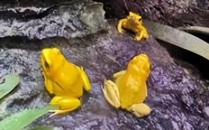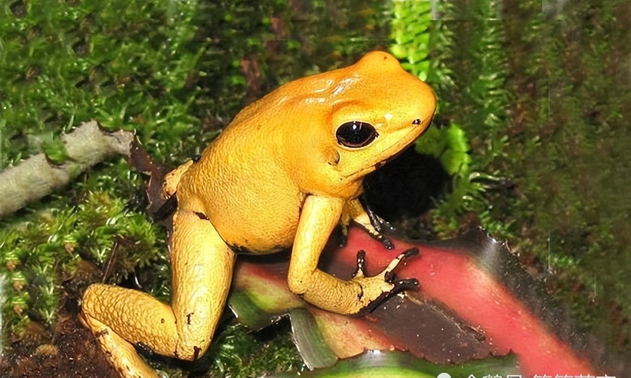 黄金箭毒蛙主要生活在美洲一带的热带雨林中,它和我们平日见到的青蛙不同。它浑身上下除了一对眼睛是黑色之外,其余部位都是金黄色分布。