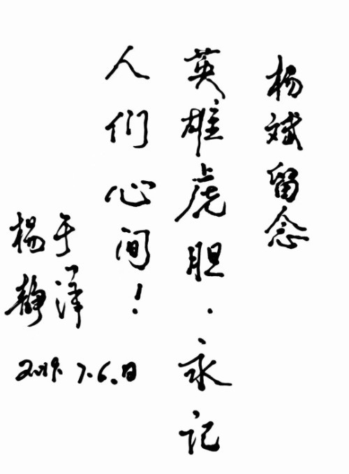 2019年,杨斌曾前往北京拜访于洋,但由于当时于老身体不适,这一面并没有见成。后来于洋得知杨斌专程去拜访他的这件事后,还亲自手写了一幅字给杨斌寄去。“杨斌留念:英雄虎胆,永记人们心间!”杨斌介绍,于老和他的爱人还在上面签了名字,“这是他对我们后辈演员的一份关爱与鼓励,老一辈的这份荣光也需要我们去传承与弘扬。”