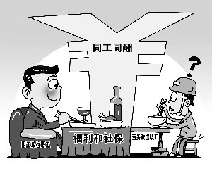 人社部相关司局负责人表示,虽然劳务派遣职工享有与用工单位的劳动者同工同酬的权利,但同工同酬不包括福利和社会保险。该负责人强调,《劳务派遣暂行规定》已明确规定用人单位要支付与用工岗位相关的福利待遇等,这意味着,在福利待遇上企业对于正式工和劳务派遣职工的标准上,是可以自己掌握的。