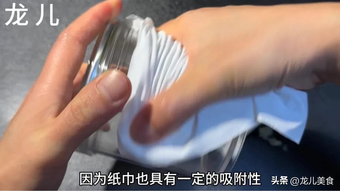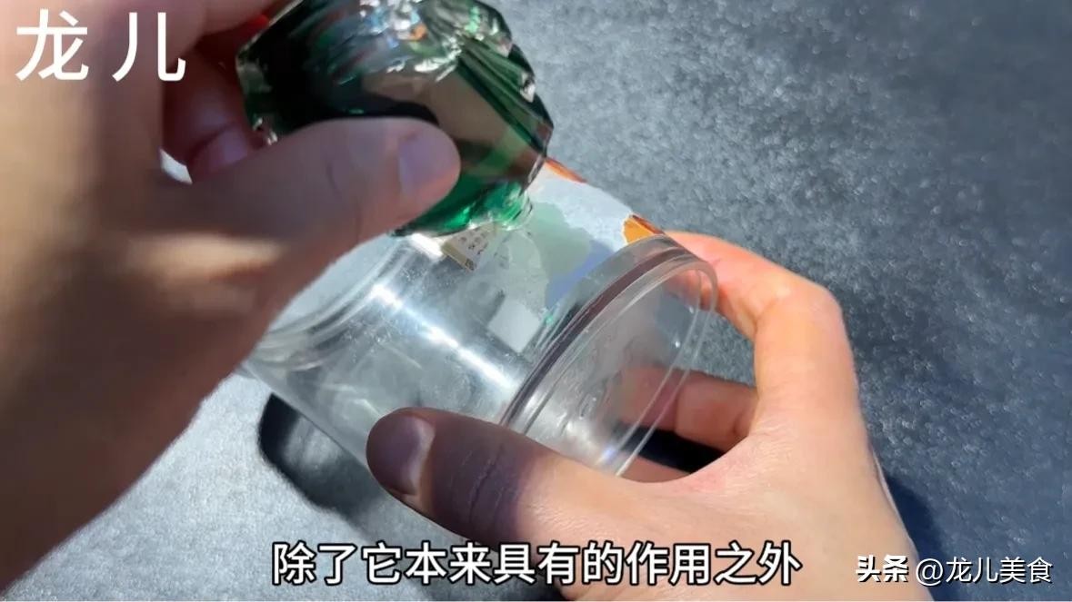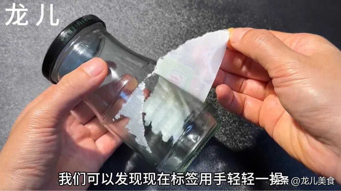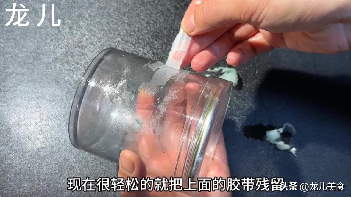 说完了不锈钢上面的胶带之后,我们现在再来说一说这种玻璃罐头瓶上面的胶带残留。玻璃瓶上面的胶带残留取出来也非常方便,但是和刚才的方法不同,我们不能用电吹风去吹,因为那样的话玻璃瓶特别容易受热后发生爆炸。