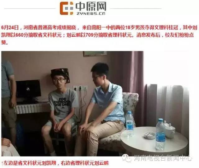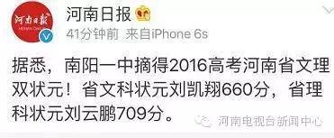 高考成绩也牵挂着众多媒体的心。晚上8点左右,多家权威媒体报道,今年河南高考文理状元都出自南阳一中,其中刘凯翔以660分摘取省文科状元;刘云鹏以709分摘取省理科状元。具体情况小编正在核实中。