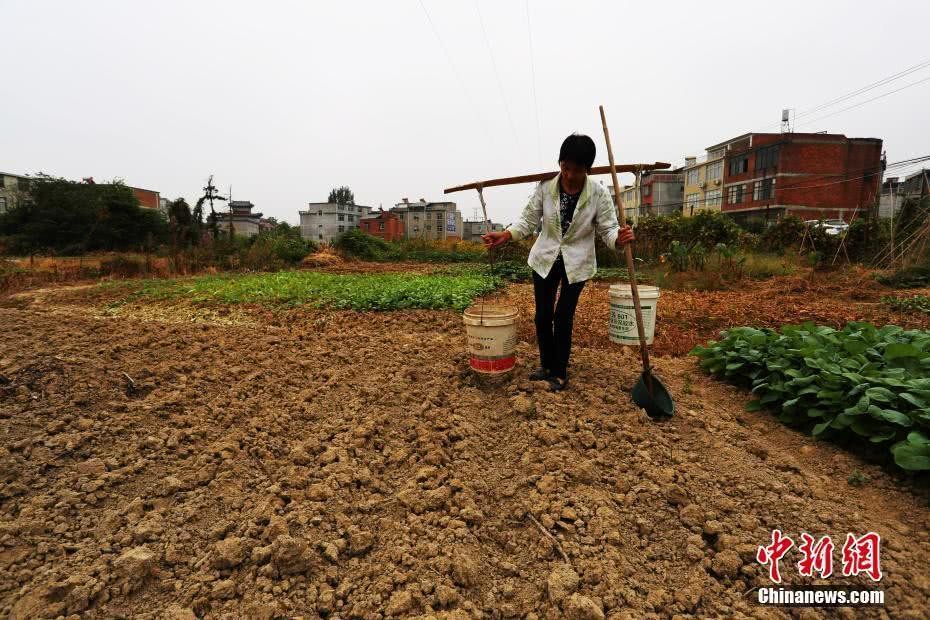 10月6日,江西省瑞昌市南阳乡严畈村村民严春菊在挑水浇地。 魏东升 摄