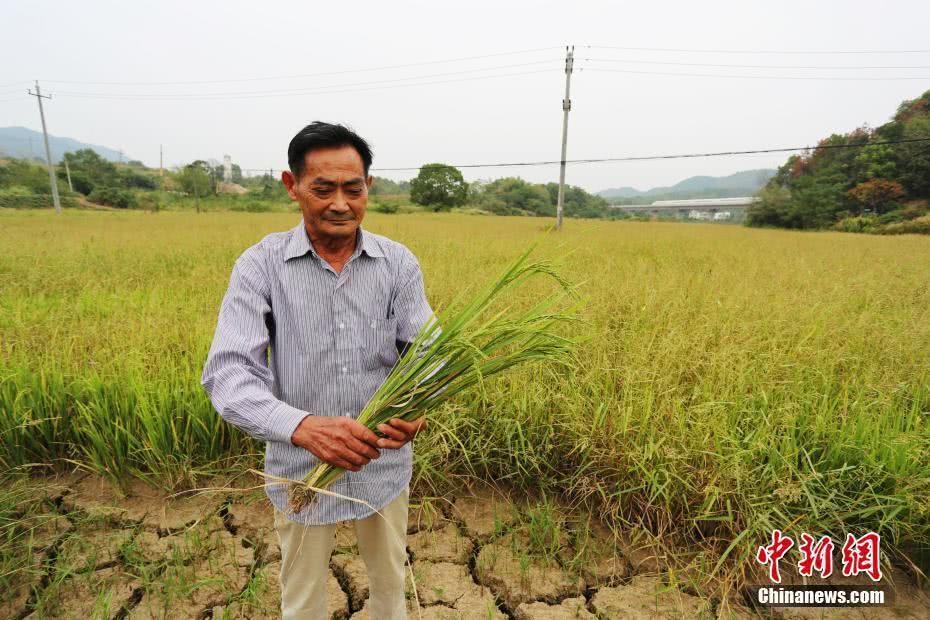 10月6日,江西省柴桑区涌泉乡长岭村村民罗家木站在干涸发裂长满稗草的稻田里介绍,由于干旱,这些稻谷将无法获得收成。 魏东升 摄