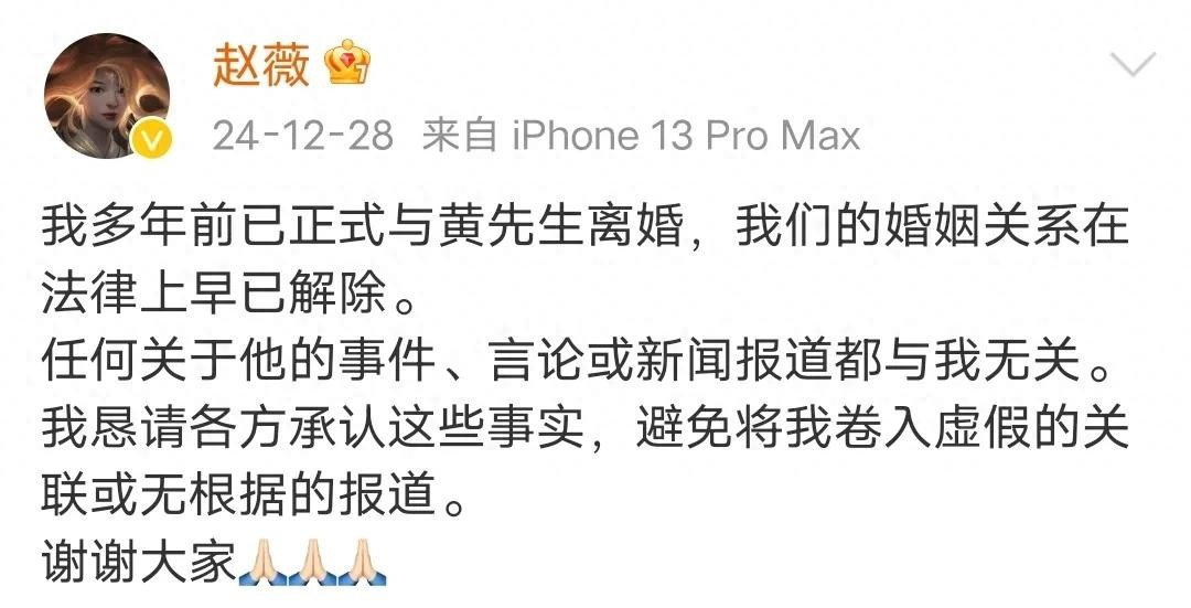 当年红极大江南北的赵薇这几年算是彻底隐退娱乐圈了。去年总共在网上更新两条动态,一条是为了缅怀琼瑶阿姨的离世,另一条则是官宣与前夫黄有龙的离婚消息。