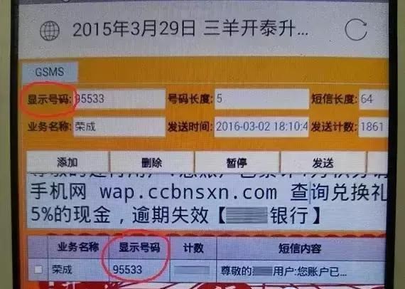 下图就是犯罪分子在笔记本电脑上群发垃圾广告和诈骗短信的软件界面。显示号码可以随意编辑成10086、95533等,中间的方框内就是可以随意编辑的诈骗短信内容!