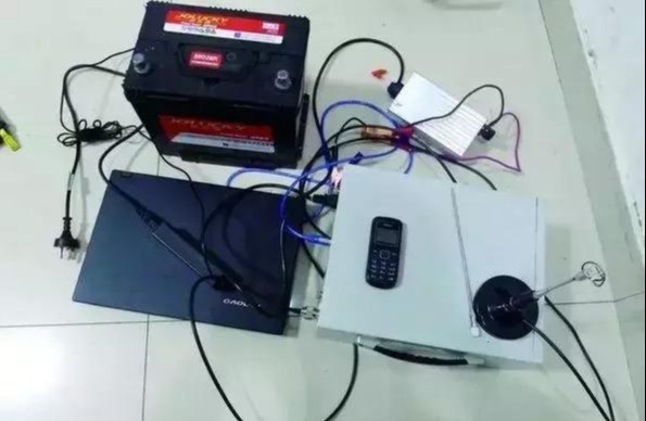 这是一套专用于发诈骗短信的伪基站设备:左下角是笔记本电脑用于操作软件,左上角是电瓶,右下角是伪基站主机箱和发射天线,右上角为主机电源。