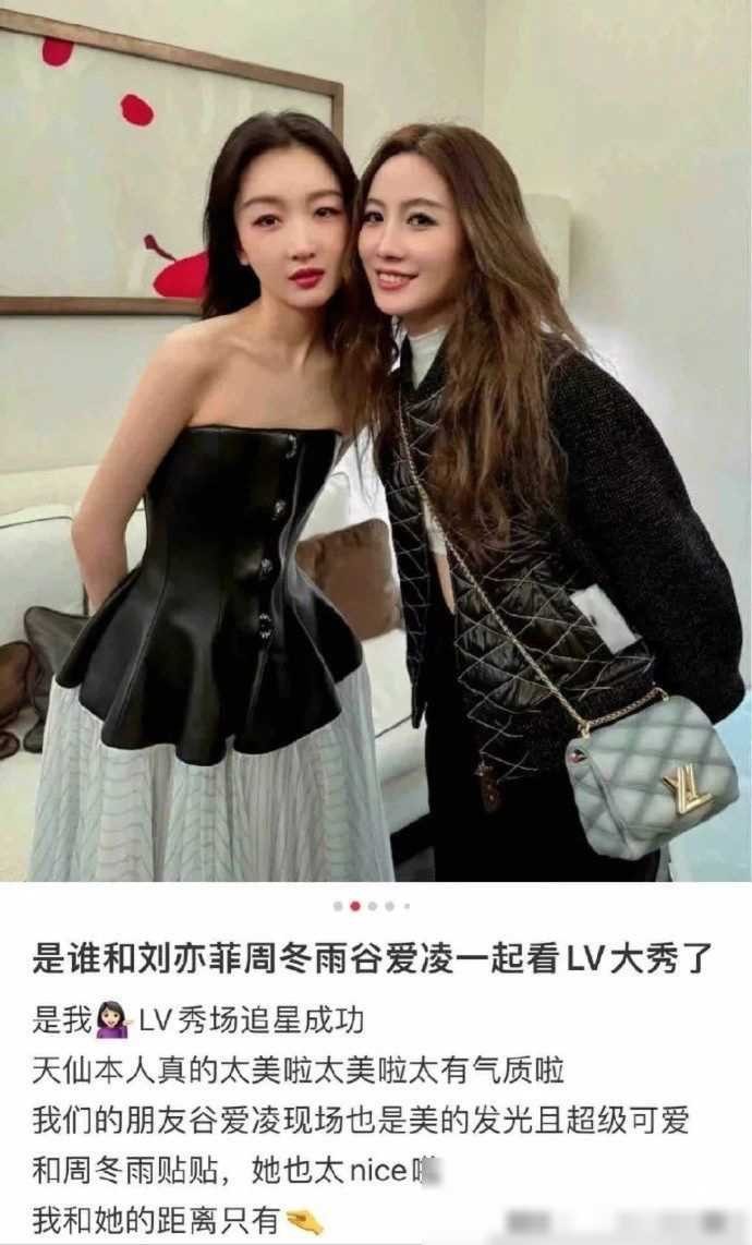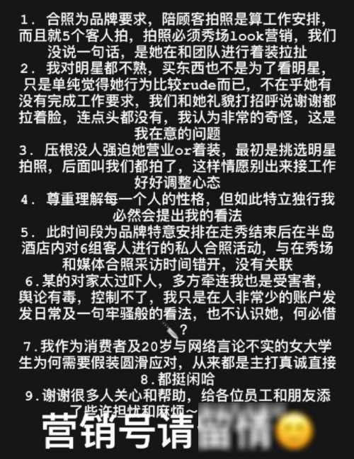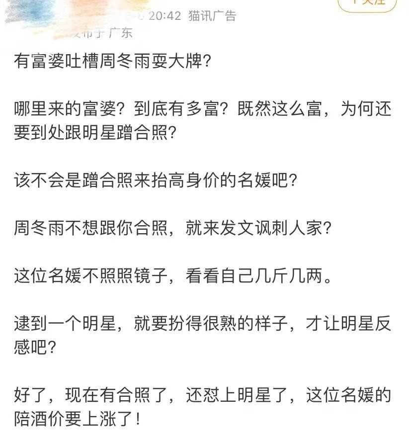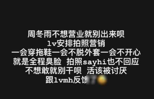 据富婆描述,她并非因追星而来,与周冬雨本人之间素不相识。在了解到拍摄合影是品牌方工作后,理应积极配合,面对他人道谢仍摆出冷面孔则令其感到不适,因此决定曝光此事,同时向LVMH反馈相关情况。从富婆分享的照片中显示,其他艺人均表现得相当友好。针对为何未有周冬雨的合照问题,富婆坦诚表示因为对方“冷漠”。