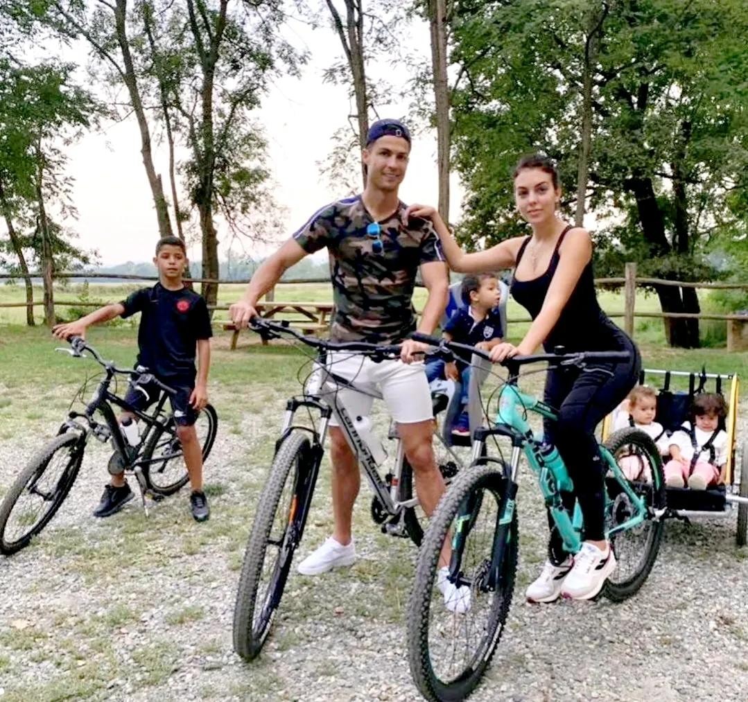 C罗带着孩子、女友骑单车锻炼身体,两个小宝宝坐在后面,超级可爱。