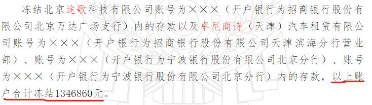 但在6天之后,南都记者从中国裁判文书网中发现,北京金泰开元汽车销售服务有限公司两次向北京市丰台区人民法院申请财产保全,要求冻结被告北京途歌科技有限公司和卓尼商诗(天津)汽车租赁有限公司两家公司的共计四个银行账户,冻结金额分别是132万和134万,总共涉及金额266万元,其中担保费用由申请方承担。
