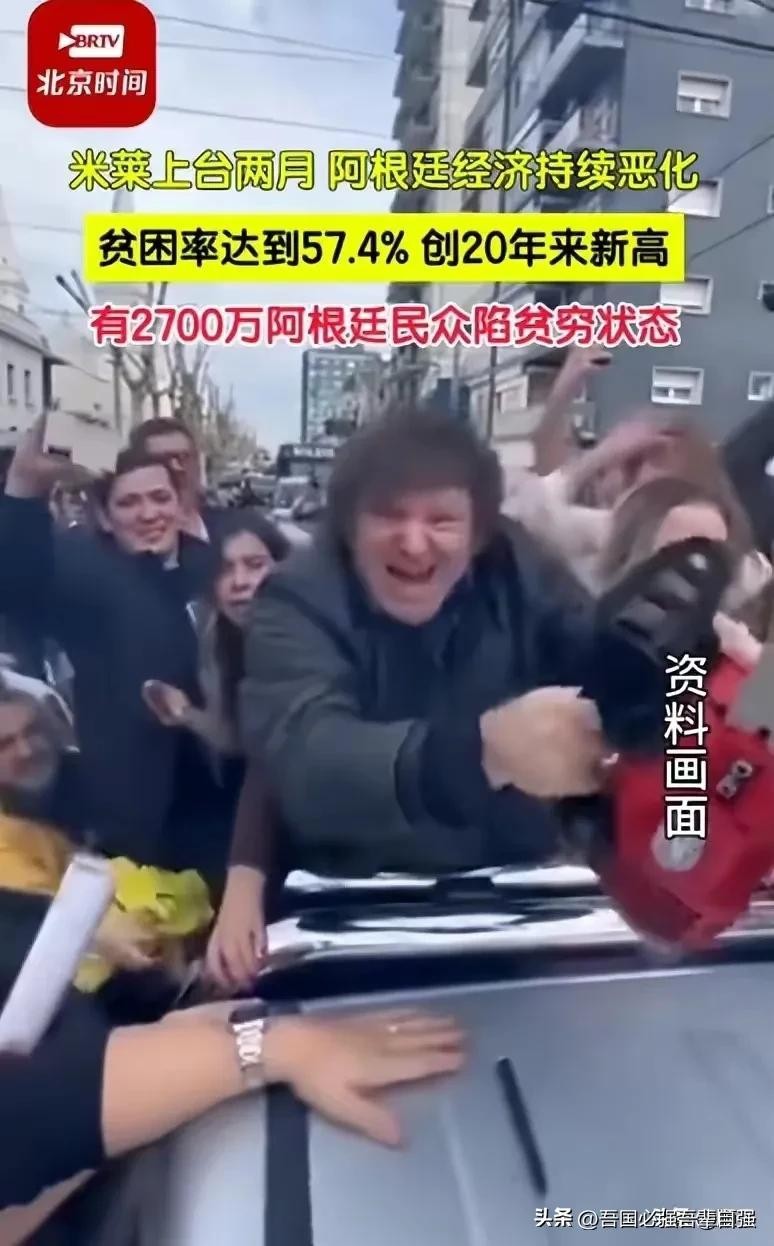 据多家媒体报道,米莱上台两个月以来,阿根廷的贫困率上涨至20年来的最高点,达到57.4%,有2700万阿根廷民众陷入贫穷状态。而截止2023年,阿根廷人口总数才4665万。大家自己算一下阿根廷的贫困率是多少。