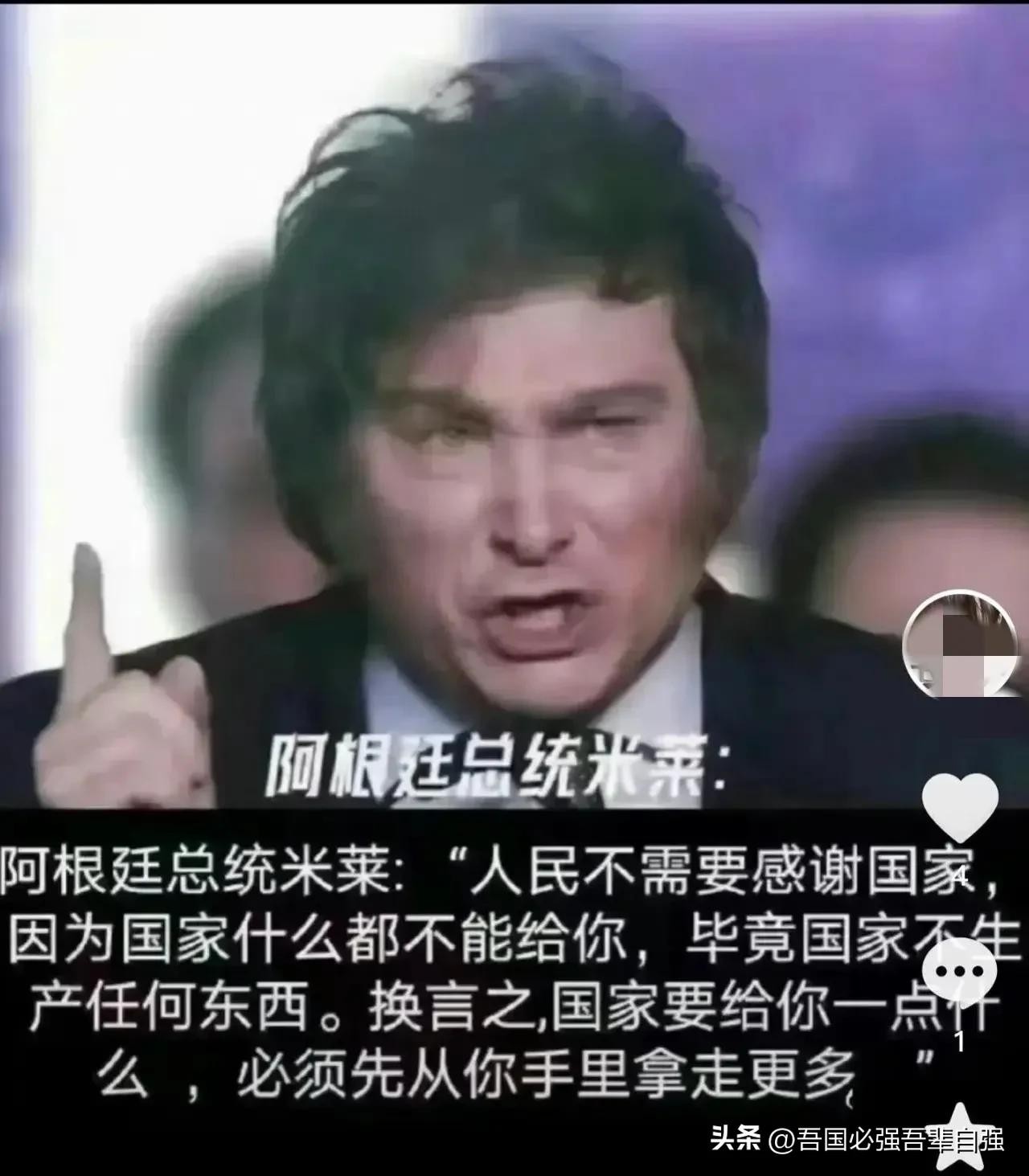阿根廷总统米莱:人民不需要感谢国家,因为国家什么都不能给你,毕竟国家不生产任何东西,也就是说国家在给你东西之前,必须首先从你手里拿走更多。