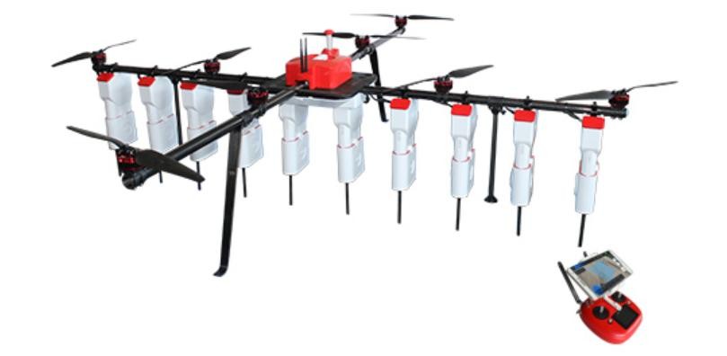 比起前几个品牌,珠海羽人成立时间相对比较晚,2011年。目前的主打产品是。农业无人机10L/10KG、农业无人机(短轴)20L/20KG,多功能农业无人机(长轴)20L/20KG。产品特点是可以灵活替换多种喷洒模块,采用了十字搭接的折叠技术。比如第二张图,无人机底部搭载了“单体种仓”,成为水稻精量直播无人机,特点是可以控制水稻播种的行距和株距。