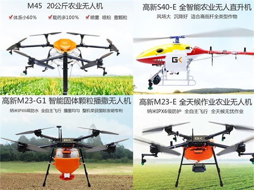 高科新农前身专注于安防,以20年军工领域沉淀的技术为基础,在2011年以提出“无人机辅助杂交水稻授粉”的概念正式进入植保无人机领域。14年开始面向市场推广,目前的产品有M45、S40-E、M23-G1、M23-E,包括了单旋翼和多旋翼植保无人机。17年推出的S40-E则是行业内首次应用RTK定位的植保无人直升机。最新产品是2018年底推出的M45,载荷为20KG,搭配嵌合式药箱,而且可以根据不同作物所需对喷头进行180°调整。