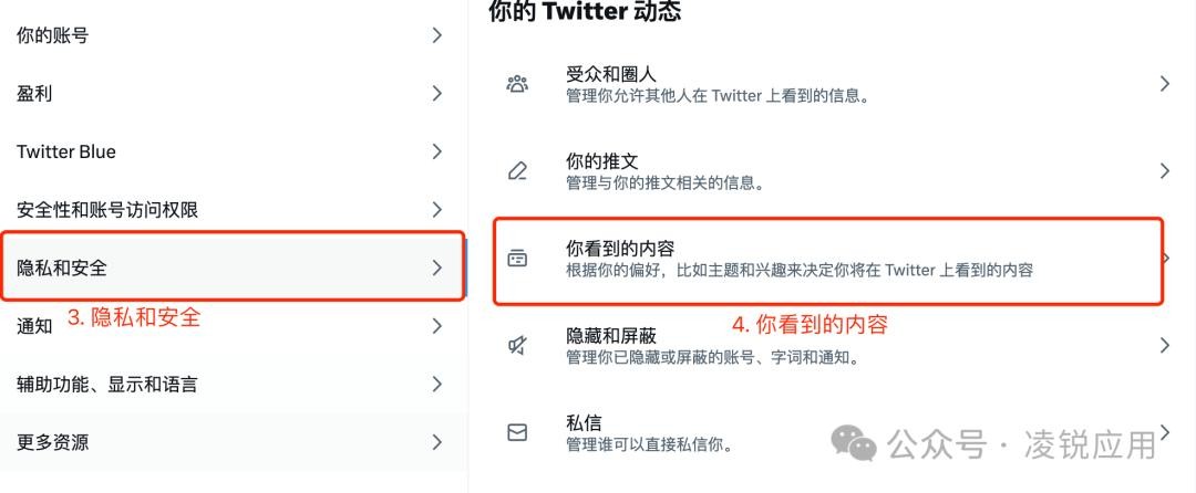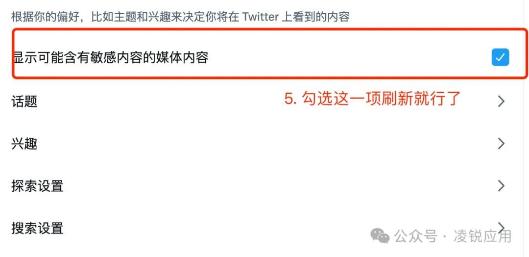 Twitter也称小蓝鸟,目前已经更名为 X,Twitter 相对来说是比较开放的一个平台,很多内容都free,但是为了用户体验,默认情况下是不展示MG信息的,如果想展示就需要主动开启,如果你想开启就按照下面的截图操作就行了。