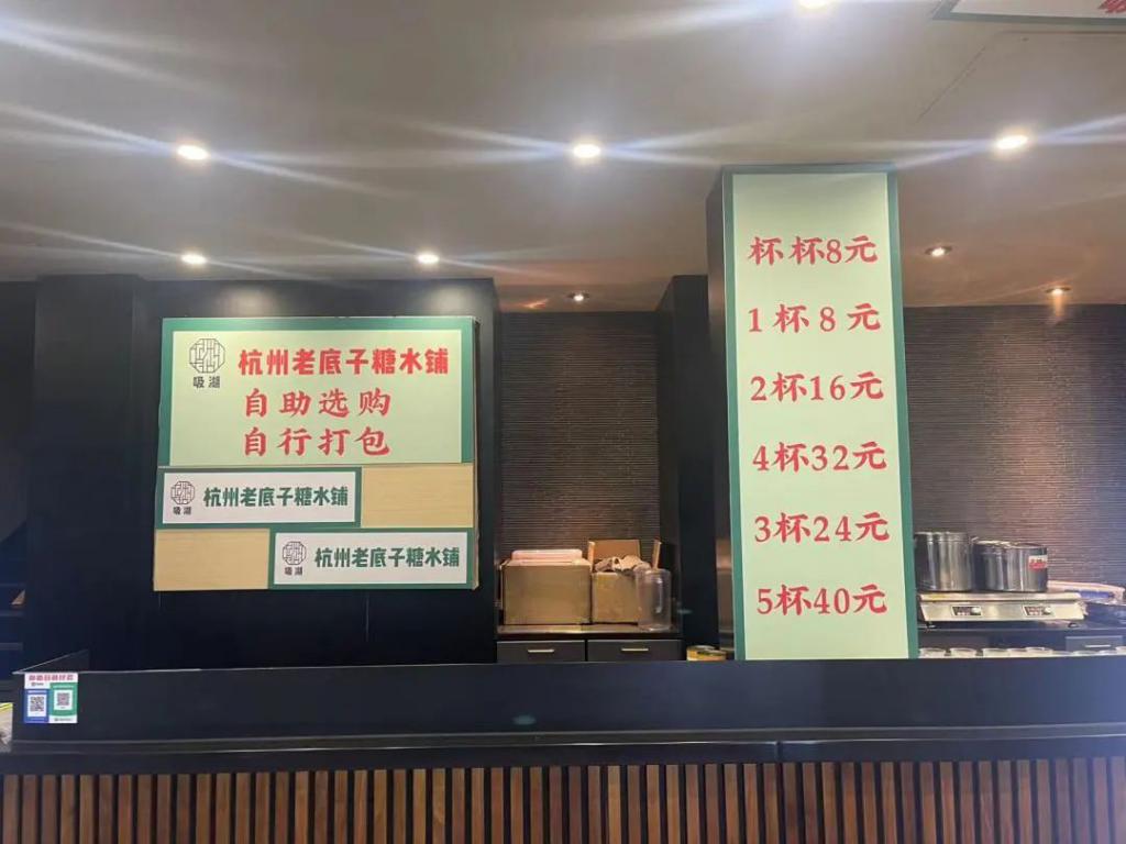 2 月 8 日,记者来到了这家糖水铺,可以看到,整个店铺还没来得及重新装修,只是把之前星巴克的桌椅撤除,放了 5-6 台大冰柜。店内墙壁上简单贴了几块 KT 板,上面写着 " 杭州老底子糖水铺 "" 杯杯 8 元 "" 自助选购 "" 自行打包 " 等字样。