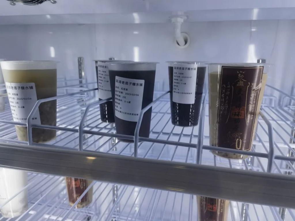 记者拿起饮品看到,杯子印有产品名字、生产日期、有效日期以及配料表等,店里的工作人员告诉记者,铺子里的糖水都是提前准备好放在冰箱里的。开业到现在还不到一周,目前只在一层营业,二楼还未开放。