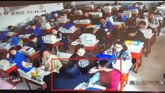 山西省阳泉市盂县荣昌学校高三应2(文)班教室内的监控视频显示,一名女子闯进该班课堂,与坐在前排的女生小霞(化名)发生冲突,当众扇了小霞一巴掌,并拽头发踹人。