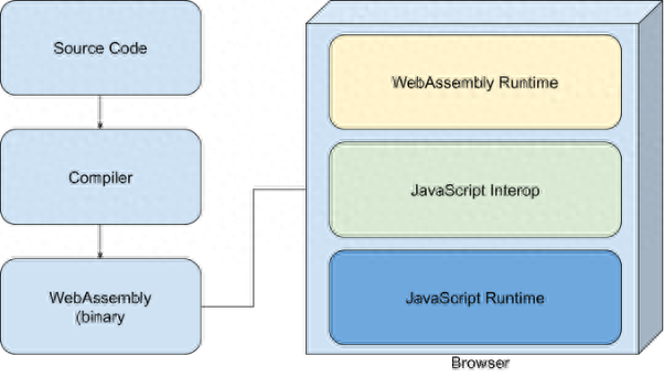 该文件可以通过JavaScript的互操作层加载到现有的JS代码,然后由WebAssembly运行时执行.wasm文件。