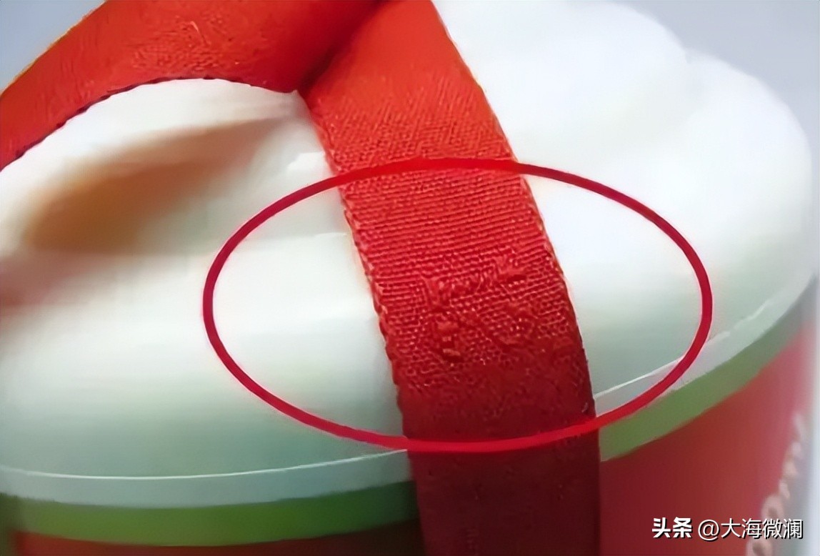 看似简单的两条红丝带,很多人都以为是装饰用的,其实这上面也有防伪处理。在茅台的丝带上会有数字的编码,这是茅台员工的编号,而且是在下压的第二条丝带上显示。如果没有编号同时出现在第一条上面的丝带上,这款茅台就是赝品。