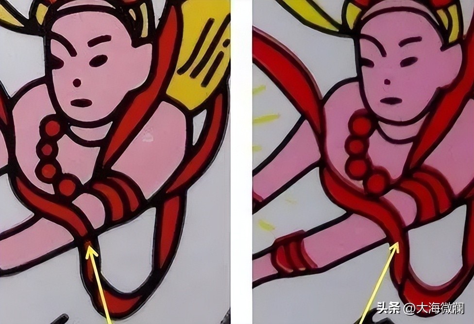 同样还是商标上的飞天仙女,在她身穿的裙子上也有防伪标记,正品茅台上的裙子网格处有一个是没有连接的,而赝品是连在一起的,这个也是作假的商家忽视的地方。